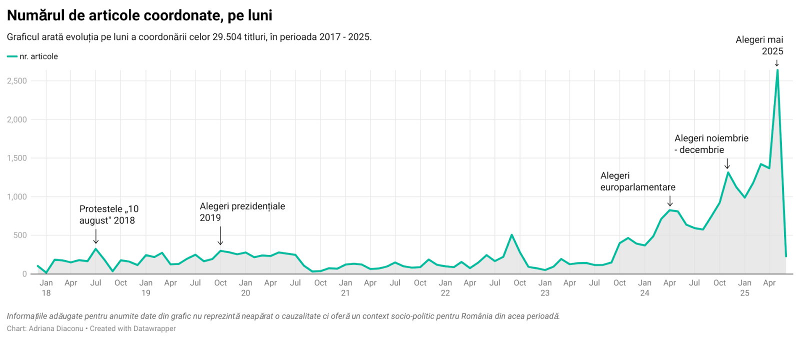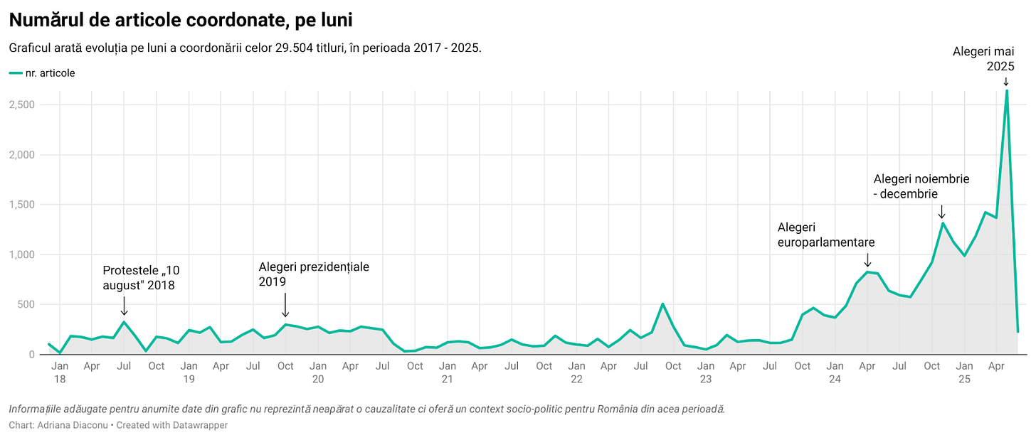 Sincronizarea postărilor de articole de tip clickbait ridică mai multe semne de întrebare dacă le punem pe o axă a timpului. Rețeaua de dezinformare devine mai activă în lunile de campanii electorale sau în momente în care societatea dezbate subiecte care inflamează publicul.