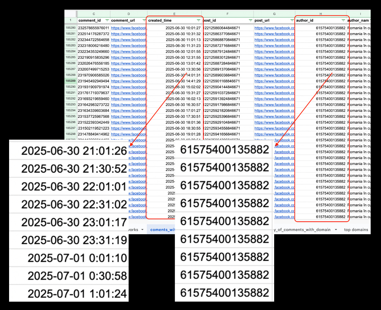 Automatizarea reiese din cadența postărilor și a comentariilor, care arată că paginile de Facebook au fost programate să se comporte ca un cor. De exemplu, în datele de mai jos puteți observa cum una dintre paginile de Facebook a fost programată să posteze și să comenteze o dată la jumătate de oră câte un link.