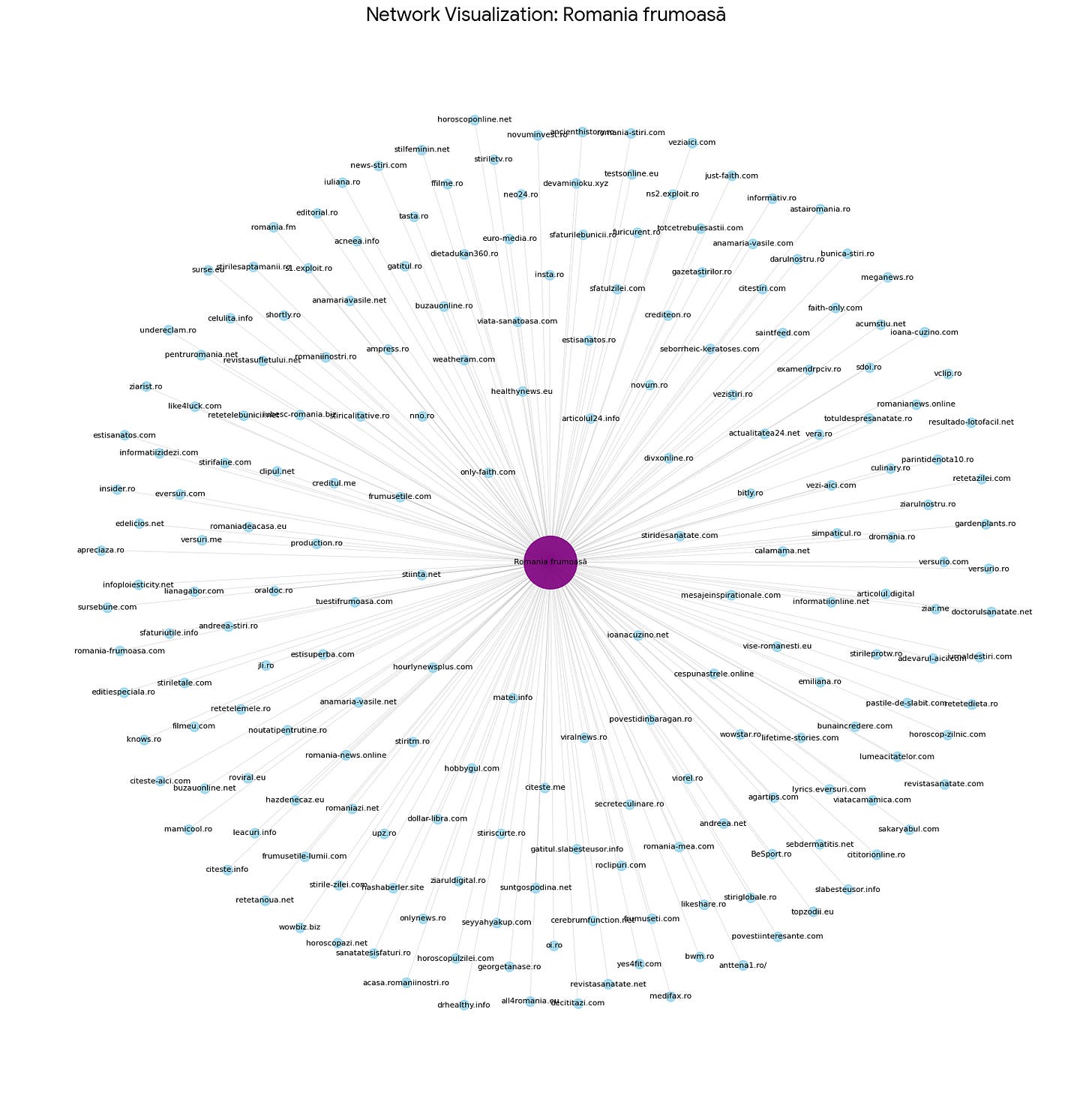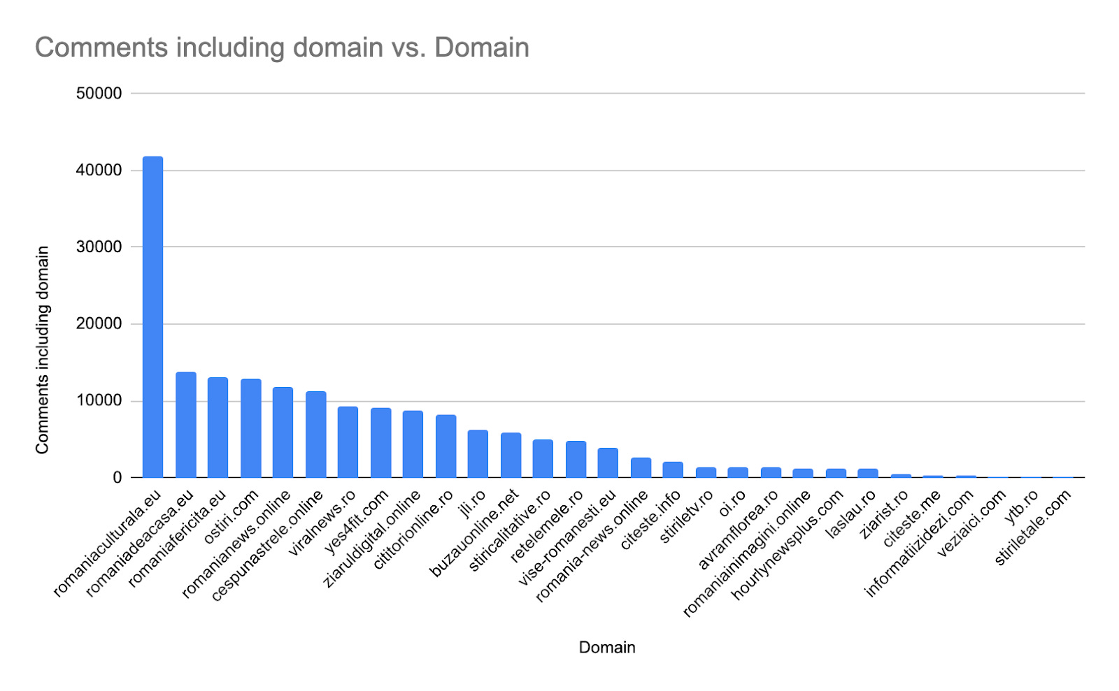 Fiecare pagină postează poze generate de AI și lasă comentarii la fiecare postare către site-uri care se prezintă ca fiind publicații de știri. Am identificat în total 184.152 comentarii care pun link în primul comentariu la diferite site-uri. Dintre ele, 179.528 de comentarii trimiteau către aceleași 21 de site-uri. Am găsit că cel mai distribuit site a fost romaniaculturala.eu, care apare în 41.887 comentarii, iar pe locul al doilea se clasează romaniadeacasa.eu și romaniafericita.eu, cu câte 13.000 mii de comentarii plasate de administratorii paginilor, trimițând audiența de pe Facebook către ele.