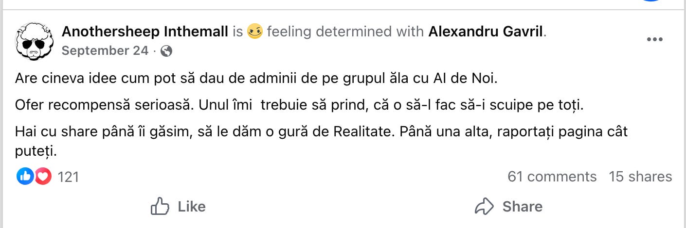 Un grup de Facebook numit „AI de noi” a adunat peste 10 mii de oameni pasionați de urmele digitale pe care le lasă propaganda și dezinformarea. Oamenii găsesc pagini suspecte care încalcă politicile Facebook sau legislația împotriva propagandei extremiste și le raportează. Uneori, acestea sunt închise, alteori conținutul lor doldora de pseudo-știință zburdă liber pe internet. Comunitatea „AI de noi” a fost inclusiv ținta unui atac al grupărilor de extremă dreapta care au raportat grupul și au reușit să-l închidă, dar Meta a revenit în cele din urmă asupra deciziei. Efortul lor de detectivistică digitală, neegalat de nici o instituție publică din România, a fost întâmpinat, de multe ori, cu amenințări.