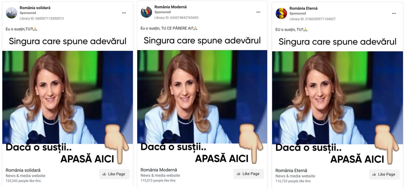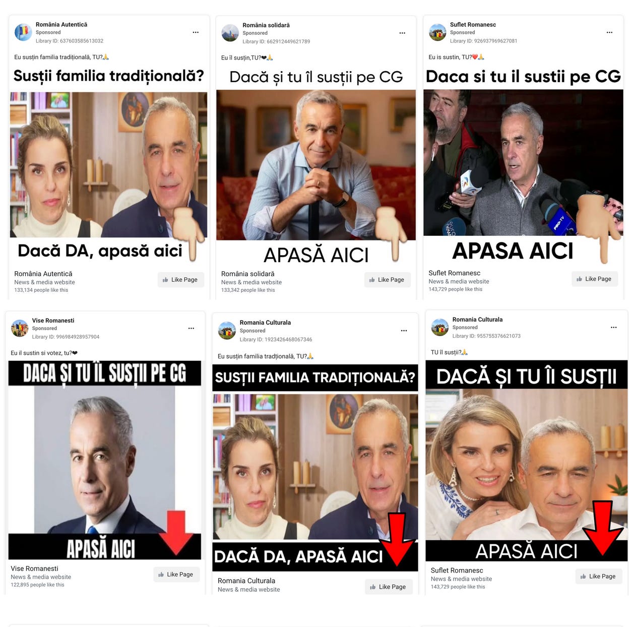 Odată creată o bază de urmăritori și aprecieri din partea votanților nostalgici, religioși și supărați pe sistem, administratorii paginilor de Facebook au dat-o pe față și au băgat reclame cu Călin Georgescu și Anca Alexandrescu.