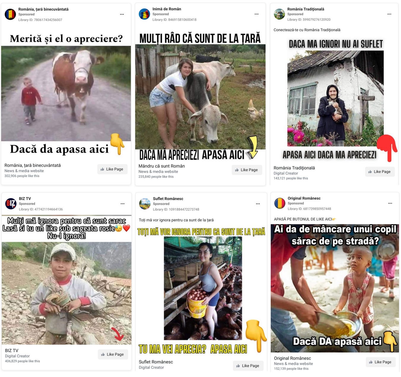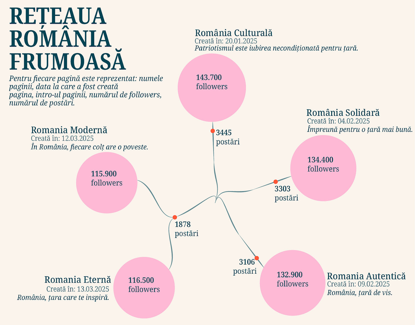 Pagini ca România Modernă, România Eternă, România Culturală, România Solidară fac parte din rețeaua pe care am botezat-o „România frumoasă”, iar administratorii au pompat între 188.300 și 231.119 lei în promovarea lor. Acestea plăteau pentru reclame în care cerșeau aprecieri, folosind cârlige religioase, care glorificau perioada comunistă sau sărăcia, imagini generate de inteligența articială și fotografii cu candidatul fascist pro-rus Călin Georgescu pentru a aduna cât mai mulți ochi și urechi gata să le urmărească. În total, datele analizate de noi arată că postările celor aproape 50 de pagini au avut 36.791.382 de afișări în ecranele românilor. Dar analiza noastră n-a cuprins sutele de pagini din rețea, iar numerele reale ar putea fi de zeci de ori mai mari.