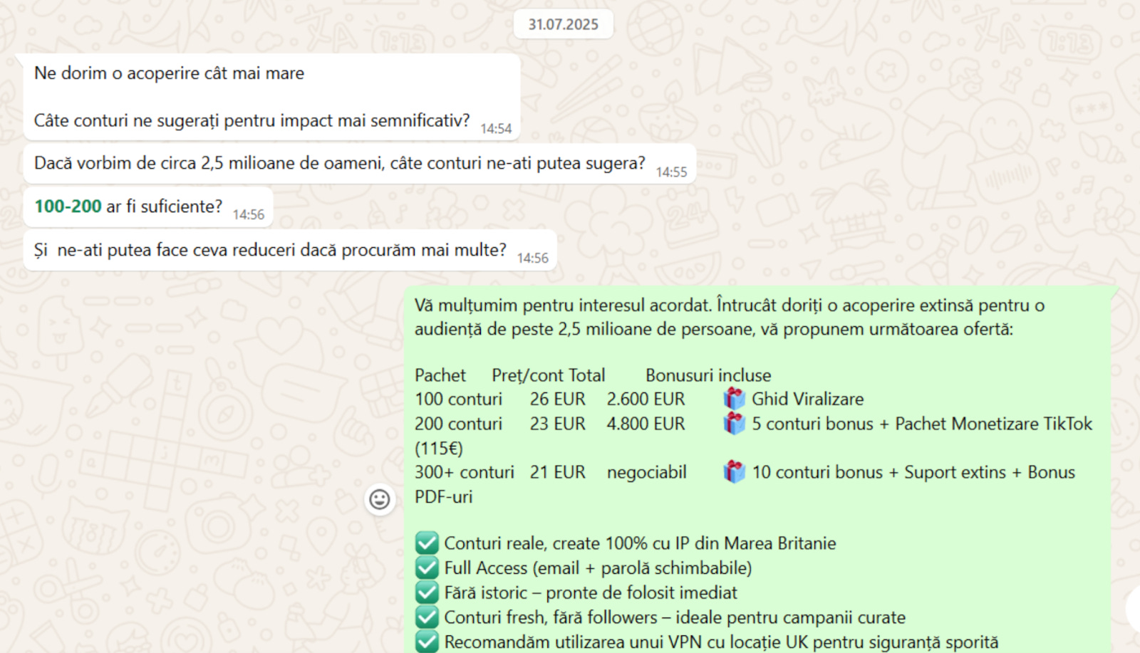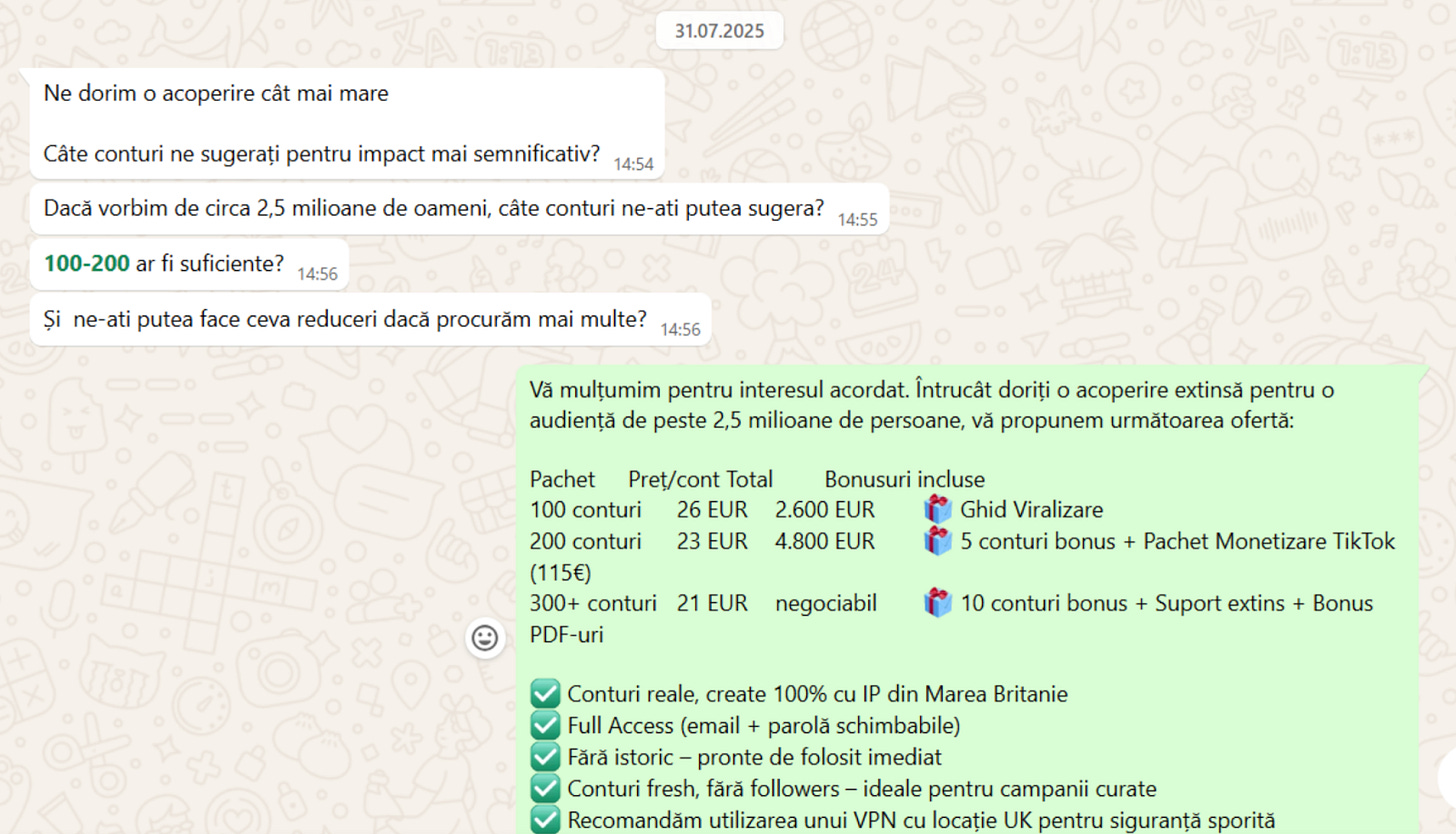 I-am cerut o ofertă de preț lui Constantin Duță de pe o identitate falsă în iulie 2025, ca să vedem ce prețuri practică. Pentru 300 de conturi de TikTok ne-a cerut 6300 de euro, iar în acești bani am fi primit și un ghid de viralizare. Duță oferă „conturi fresh, fără followers – ideale pentru campanii curate”, iar „în caz de blocare la logare, asigură înlocuirea conturilor gratuit”, mai dă bonus și „100.000 vizualizări organice” și „suport gratuit pentru strategia de conținut plus idei de postare cu impact viral”.