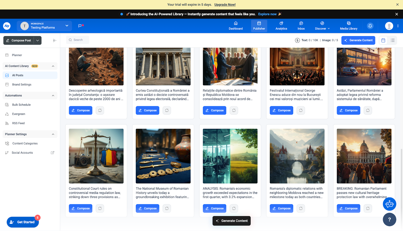 Am identificat între timp și platforma folosită pentru a genera conținutul care a infestat internetul românesc. Paginile de Facebook monitorizate au lăsat 35.688 comentarii cu linkul cstu.io, care redirecționa oamenii către site-uri ca BuzauOnline sau România Culturală. Linkul duce de fapt către platforma Content Studio, o aplicație care funcționează pe baza unui soft AI, care este alimentat cu identitatea unui site și generează conținut cu același profil pentru Facebook, TikTok, Instagram și cam orice rețea socială. Mai jos puteți observa cum AI-ul Content Studio „instantly generates content that feels like you.” (trad: generează instant conținut în stilul tău).