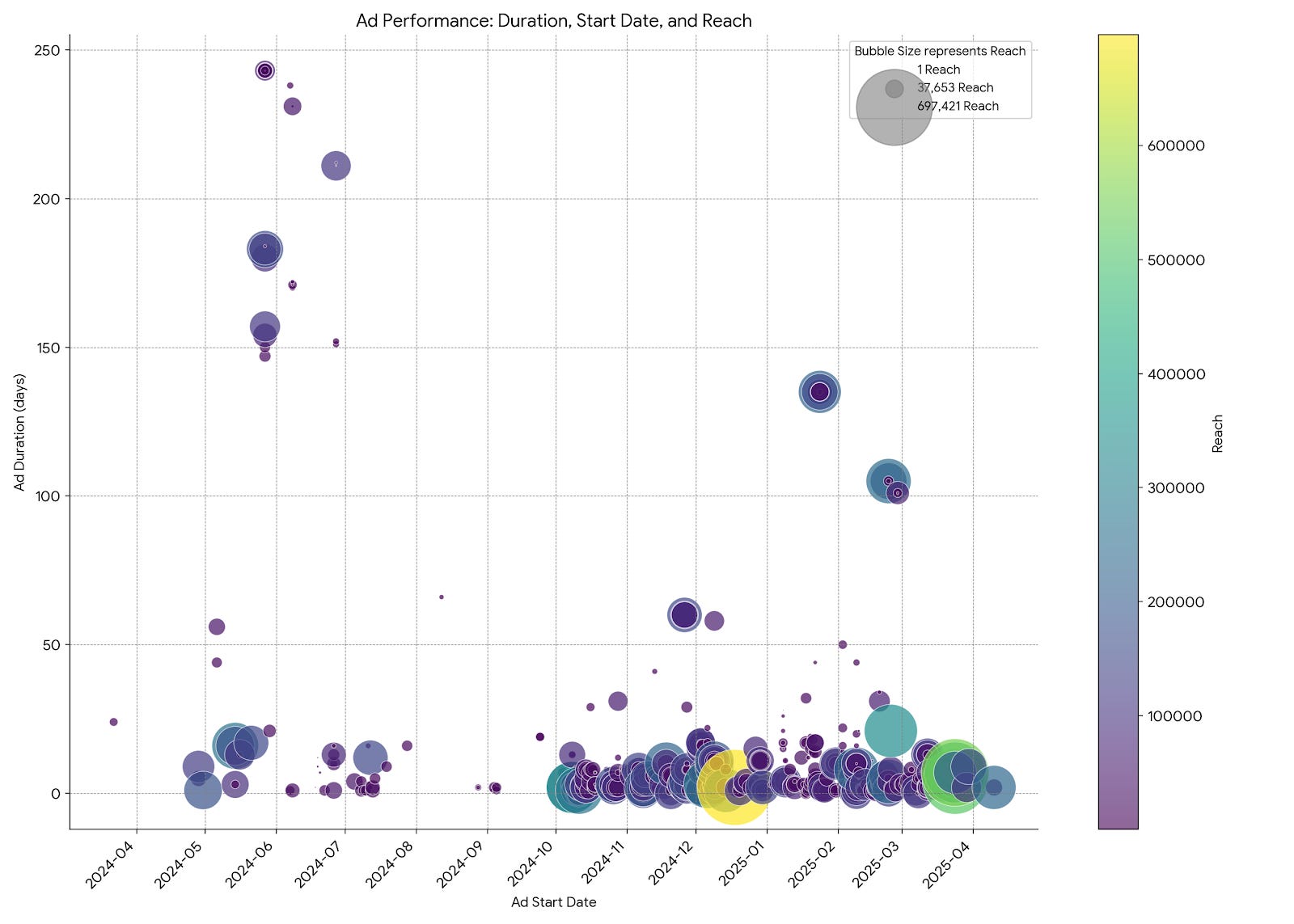 Colectând date despre 867 de reclame, banii investiți și audiența lor, putem observa în primul rând că acestea au fost mai active în perioade electorale. Mai întâi, băieții au investit masiv în perioada campaniei electorale pentru alegerile locale și europarlamentare din 2024, când au trecut total pe sub radar. Nici statul român nu era prea atent la dezinformarea online, nici grupul de Facebook „AI de noi” nu exista, dar reclamele zburdau sub ochii românilor într-o veselie.