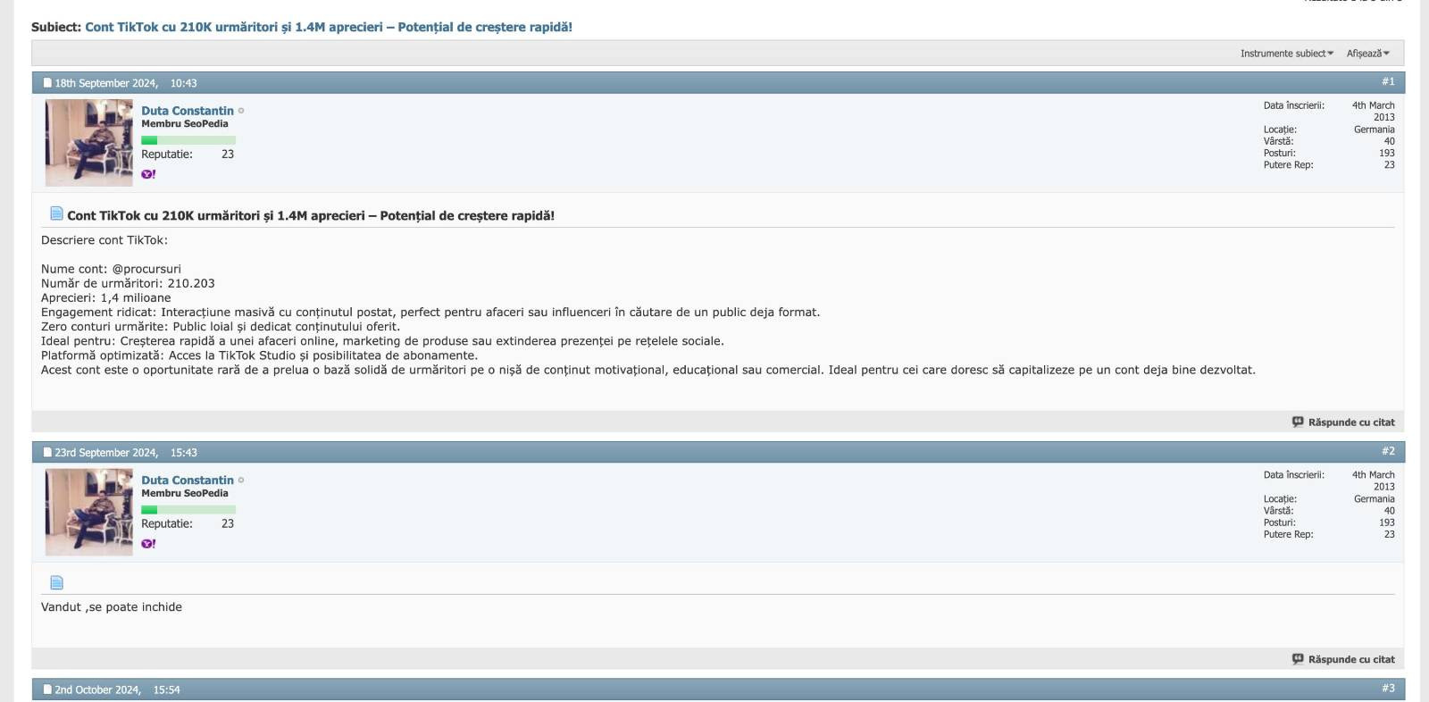 Se întâmpla în septembrie 2024, înainte de controversatele alegeri prezidențiale influențate pe TikTok de conturi rusești și agenția Kensington angajată de PNL. Atunci, Duță vindea un cont de TikTok cu denumirea @proconcursuri, iar asta venea la pachet cu 210 000 urmăritori și peste 1,4 milioane de aprecieri. „Acest cont este o oportunitate rară de a prelua o bază solidă de urmăritori pe o nișă de conținut motivațional, educațional sau comercial.”