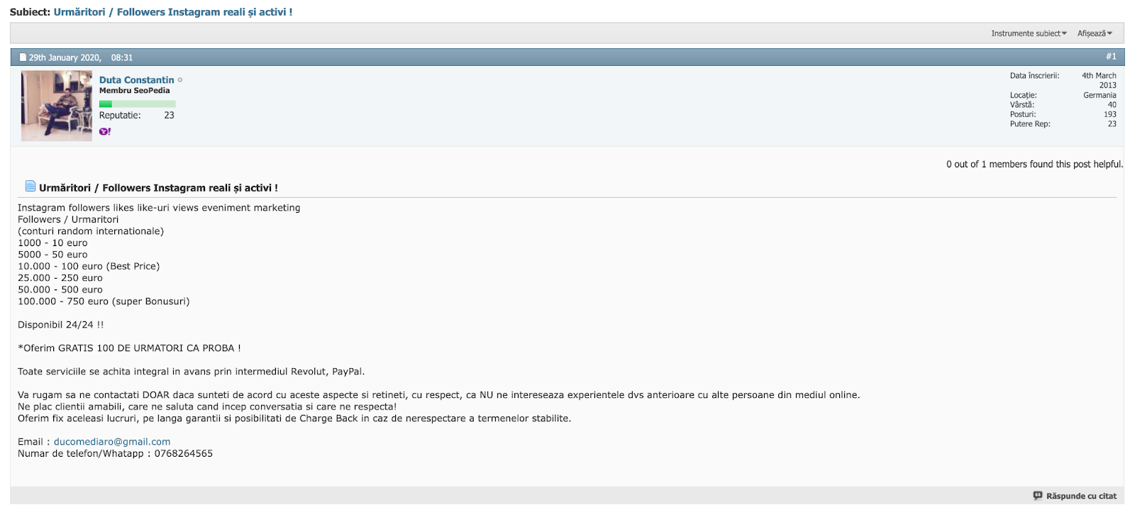 Duță și-a închis site-ul în vară, după alegerile prezidențiale. Știm că afacerile lui au mers bine dintr-o postare de pe un forum pe care era activ înainte de alegerile din 2024. În datele de logare de pe calculatorul său, cele subtilizate de virus și care au ajuns publice, am găsit adresa de email ducomediaro@gmail.com. De pe această adresă de email Duță anunța în 2020 că are de vânzare urmăritori de Instagram, iar prețurile nu erau chiar mici. Pentru 100.000 de followers „reali și activi” trebuia să plătești 750 de euro. Dacă voiai să fii doar puțin mai popular, puteai să îți achiziționezi și un pachet mai mic, de doar 1.000 de followers la numai 10 euro.
