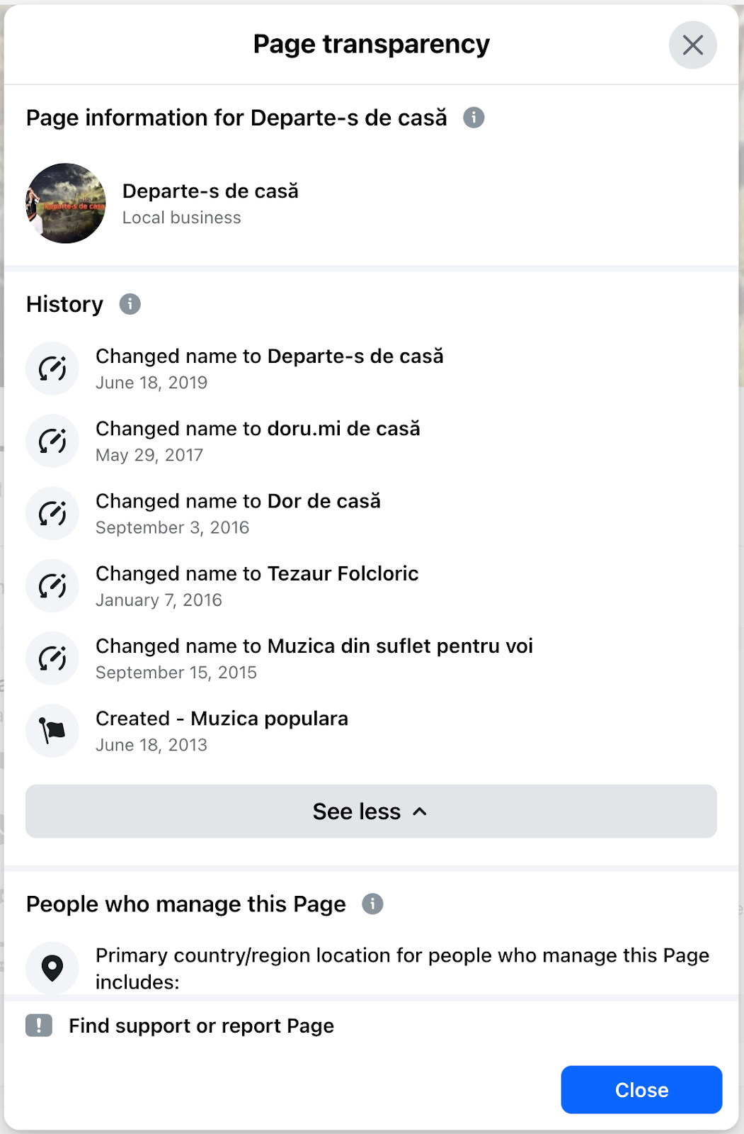 Una dintre paginile de Facebook din rețea, Departe-s de Casă, listează o adresă de email de contact în descrierea paginii: mesaje.de.interes@gmail.com. Pagina are 163 de mii de următori și, spre deosebire de celelalte, nu e recent înregistrată, ci are venerabila vârstă de 12 ani. La început a livrat doar muzică populară, pentru audiențele care apreciază genul.