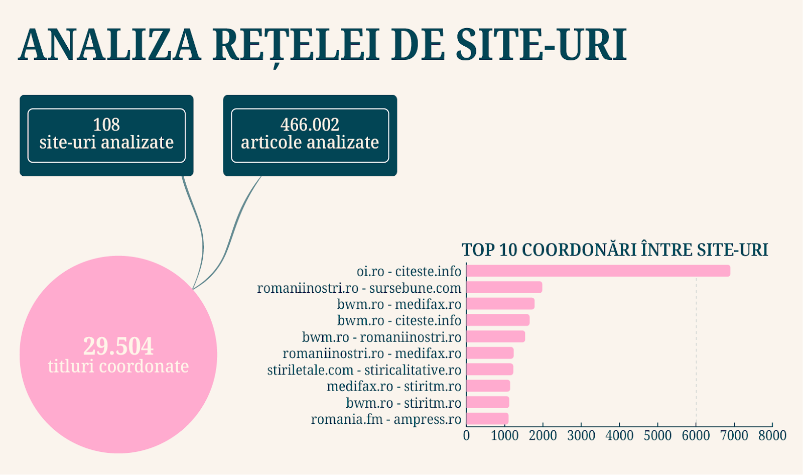 Mai mult decât atât, am descărcat zeci de mii de texte deghizate în materiale jurnalistice de pe aceste site-uri, iar o parte dintre ele publică simultan aceleași texte. Unele dintre site-uri s-au preluat între ele de mii de ori de la înființare și până în prezent, ca în infograficul de mai jos.