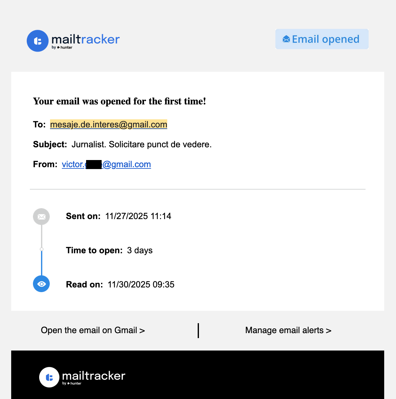 Deși Ilie nu mai are acces la mesaje.de.interes@gmail.com, cineva are, căci l-a primit și a deschis mailul cu întrebările noastre în legătură cu operațiunea de dezinformare.