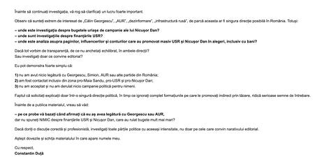 Pe conturile personale, Duță s-a poziționat politic anti-Elena Lasconi, la alegerile din 2024, și anti-Nicușor Dan la alegerile din 2025. Dat fiind că a încercat să ne mintă că a negociat cu partidul președintei Maia Sandu, nu avem motive să-l credem când ne spune că cel puțin unul dintre conturile vândute de el au ajuns la un susținător al candidatei Elena Lasconi. Mai mult, a refuzat să ne răspundă la întrebări insistând să îi investigăm mai degrabă pe Nicușor Dan și echipa sa de campanie.