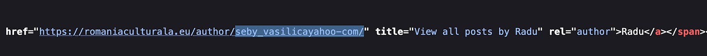 Nu ne e clar unde și ce a greșit Radu la capitolul programare în luna martie 2025, însă a expus fără să vrea adresa de email cu care controlează site-ul RomaniaCulturala.eu. De atunci, fiecare semnătură a unui articol afișează în back end adresa lui de email.