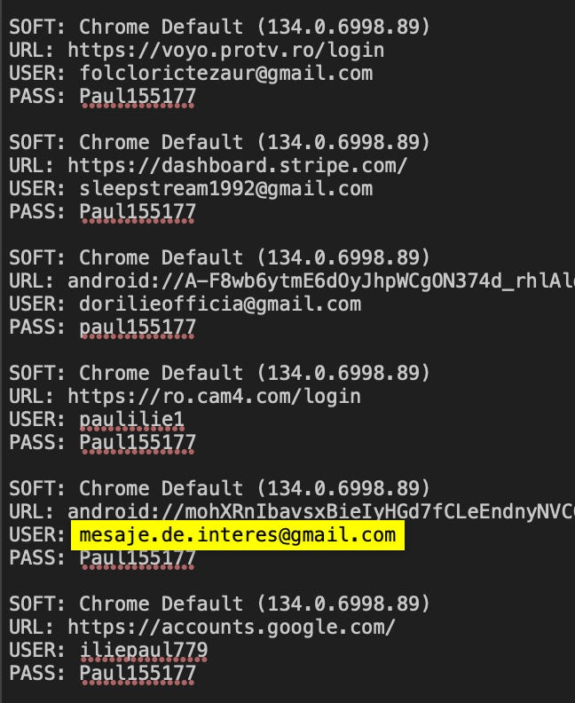 Conform altor date scurse pe darknet pe care le-am găsit tot pe Intelx.io, un calculator din Sibiu care folosește browserul Google Chrome a avut salvată această adresă de email și parola aferentă. De fiecare dată când calculatorul se deschidea, utilizatorul de internet se loga automat în mailul mesaje.de.interes@gmail.com cu parola Paul155177.